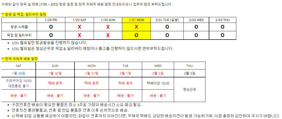 중요!!!2022년도 설 연휴 항공스케줄 공지 합니다.